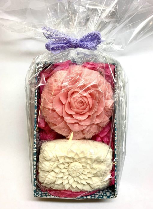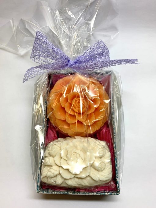 Tvær útskornar sápur, önnur minni hin stærri. Engin sápa eins. Sápurnar eru skornar út af Saliku sem á og rekur Jurtahúsið og vinkonu hennar. Athugið takmarkað magn. Upplagt að gefa í jólagjöf. Henta sem skraut á baðherbergjum. Aðeins selt á staðnum í Jurtahúsinu. Því miður ekki hægt að senda í pósti því þær gætu brotnað á leiðinni. Koma í gjafakassa með sellófóni og slaufu.